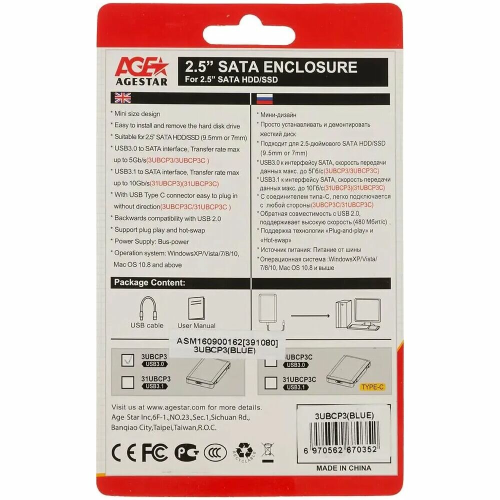 AgeStar (3UBCP3-Blue)(Внешний бокс для 2.5" Sata Hdd, Usb3.0)