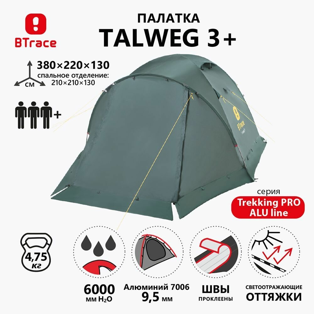 Палатка кемпинговая трёхместная Btrace Talweg 3+, зеленый