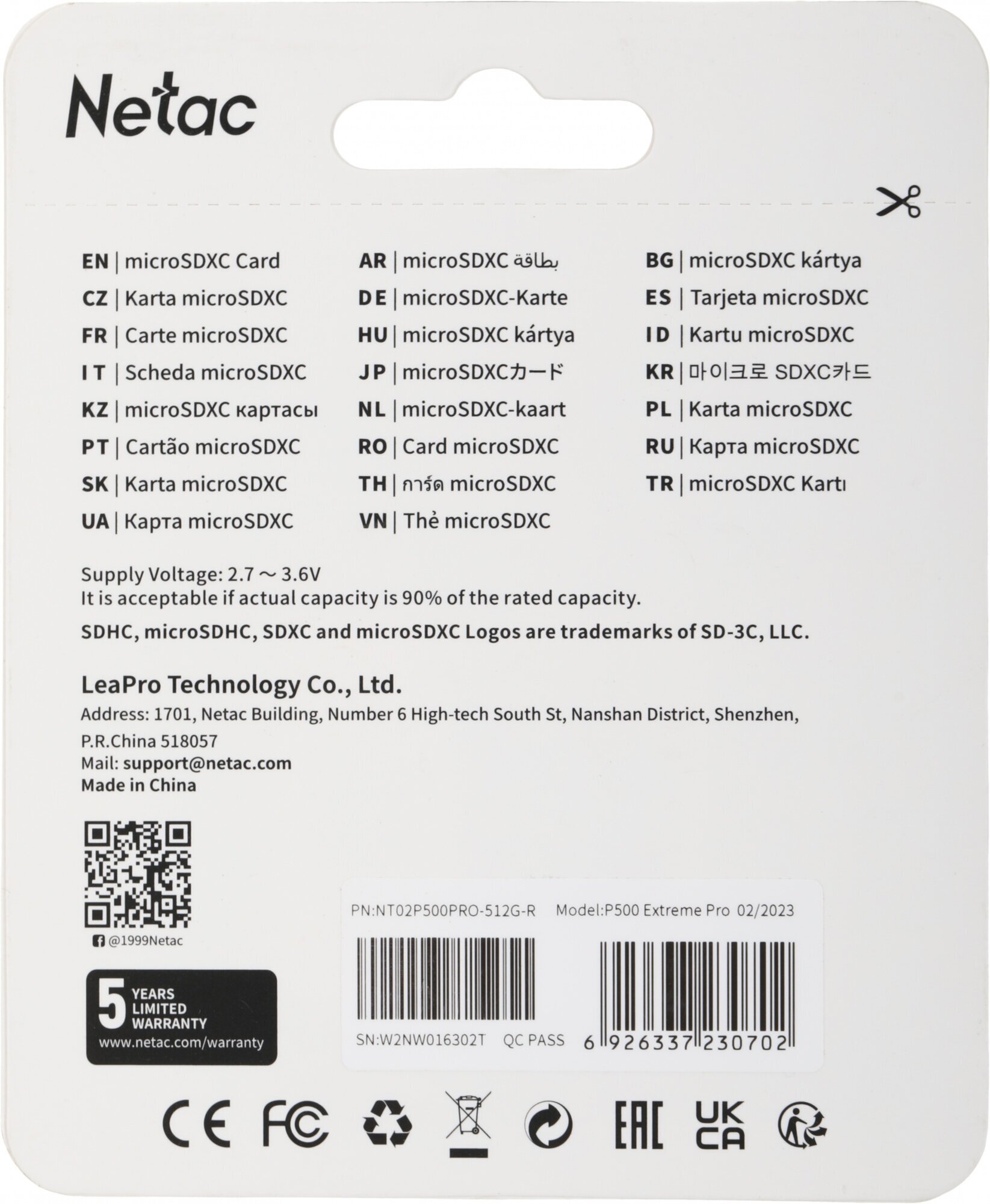 Карта памяти microSDXC 512ГБ Class10 Netac P500 Extreme Pro UHS-I U3 (nt02p500pro-512g-r)