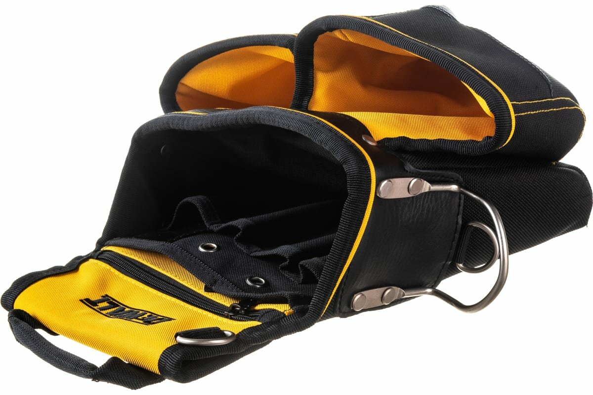 | Плюсы: | Качественный крепкий материал, большой размер самой сумки по сравнению с моим стареньким stayer. В два маленьких кармана свободно встают оранжевые болксы из системы хранения DeWalt. На одной сумке и крепление под рулетку, и скоба для молотка и скобы для карабинов ручного инструмента. |
