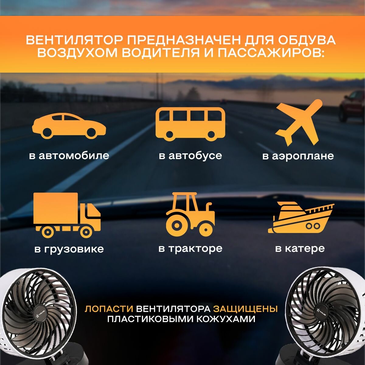 Вентилятор в салон Airline двойной, 2x15 см, 12 В, раздельная регулировка, пластик ACF-12-06 .