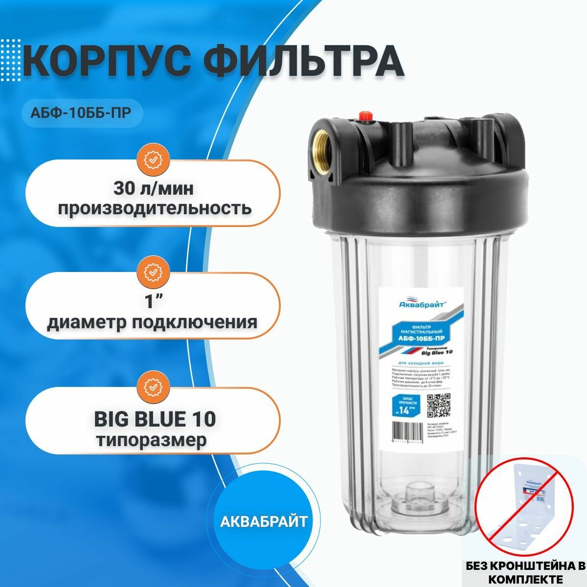 Магистральный фильтр Аквабрайт АБФ-10ББ-ПР, 10 Big Blue, 1"