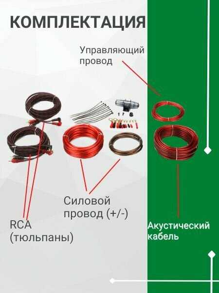 | Комплектация | силовой кабель КСнетМТ8 красный: 5 м сечением 8 GA (8,36 мм²); силовой кабель КСнетМТ8 черный: 1 м сечением 8 GA (8,36 мм²); акустический кабель КАнетМТ16 10 м сечением 16GA (2х1,32 мм²); межблочный 2RCAнет2RCA кабель КМ 2RCAнетМТ5М: 2 комплекта длиной 5 м (прямыеестьугловые RCAнетразъемы); 1 держатель с компрессионными зажимами с предохранителем типа MiniANL на 40А; управляющий кабель сечением 18GA (0,82 мм²): 5 м; 2 клеммы кольцевых для силового кабеля сечением 8 GA (8,36 мм²); 2 клеммы Uнетобразных для силового кабеля сечением 8 GA (8,36 мм²); 5 клемм Uнетобразных для акустического кабеля сечением 16GA (2х1,32 мм²); 1 защитная резиновая втулка для протяжки силового кабеля в салон автомобиля; 1 изоляционный наконечник для управляющего кабеля; 2 винта черных; 10 хомутов зажимных |
