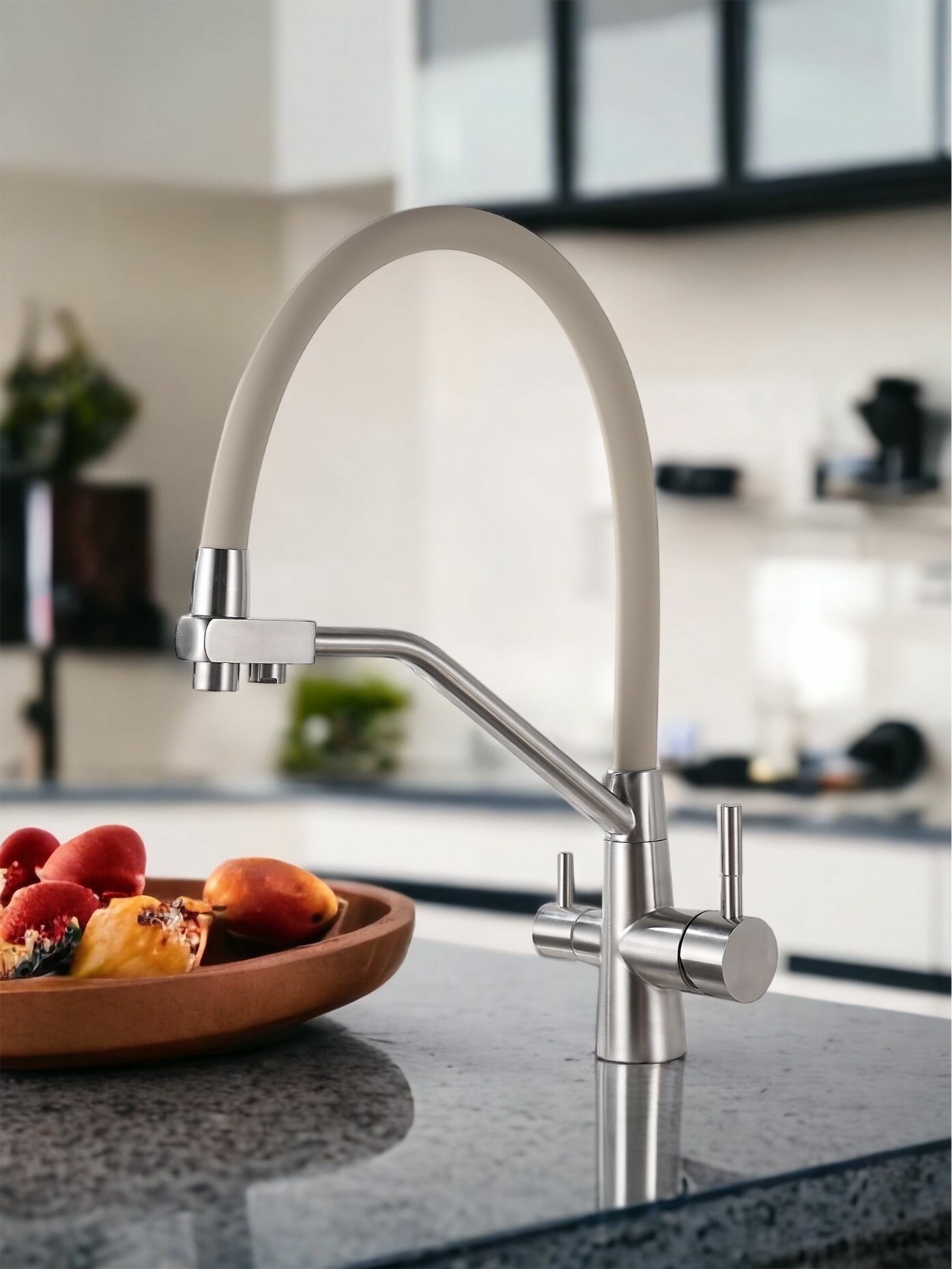 Смеситель для кухни OUTE белый, однорычажный, с дополнительным выводом под фильтр питьевой воды, с гибким изливом.