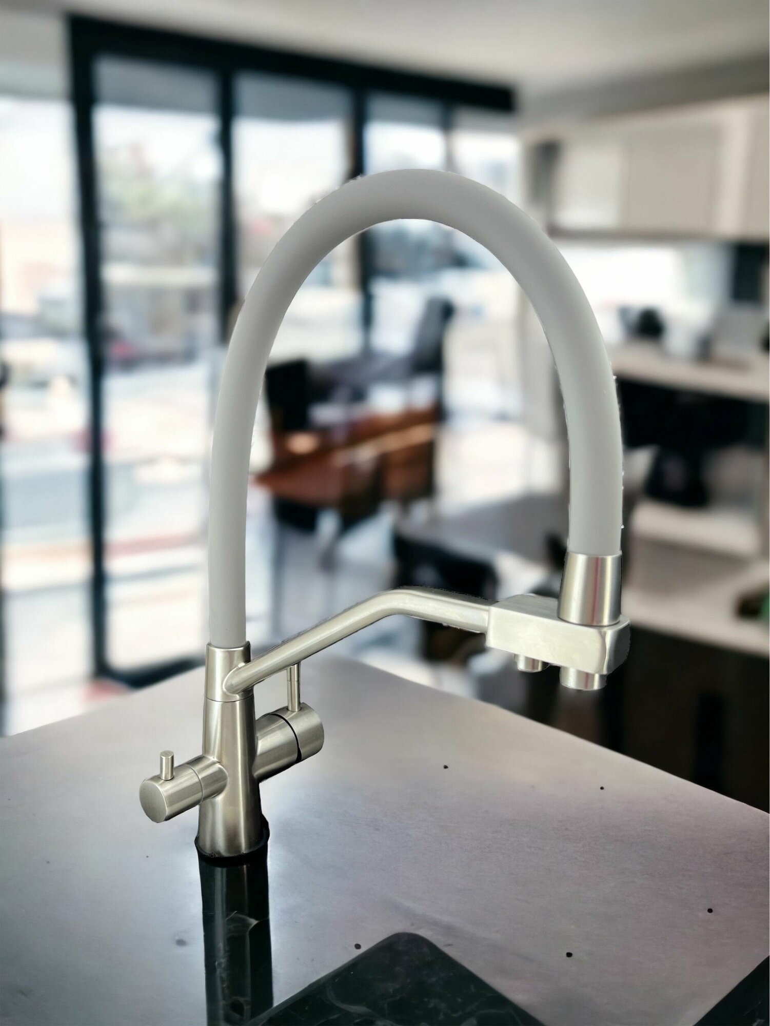 Смеситель для кухни OUTE матовый хром с кофейным изливом, однорычажный, с дополнительным выводом под фильтр питьевой воды, с аэратором, с гибким изливом.