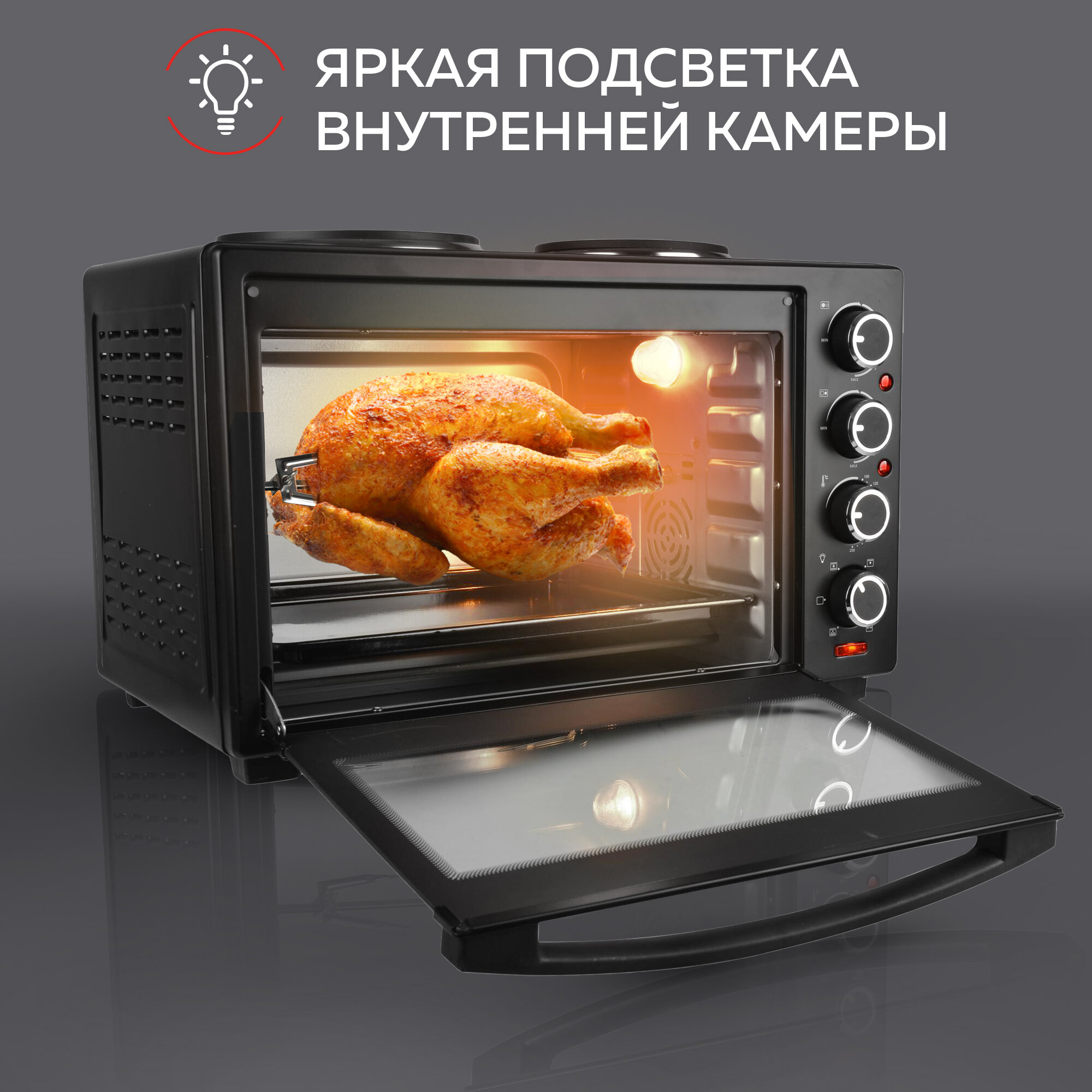 Многофункциональная мини-печь GFGRIL GFO-40 HOT PLATES, 2 конфорки,вертел, шашлычница, коврик для выпечки