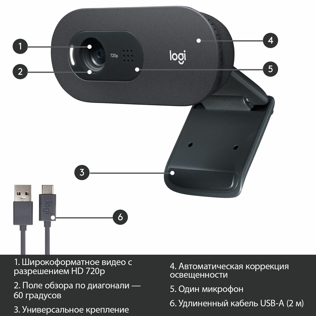 Веб-камера Logitech HD Webcam C505, автоматическая фокусировка, USB, встроенный микрофон, черный