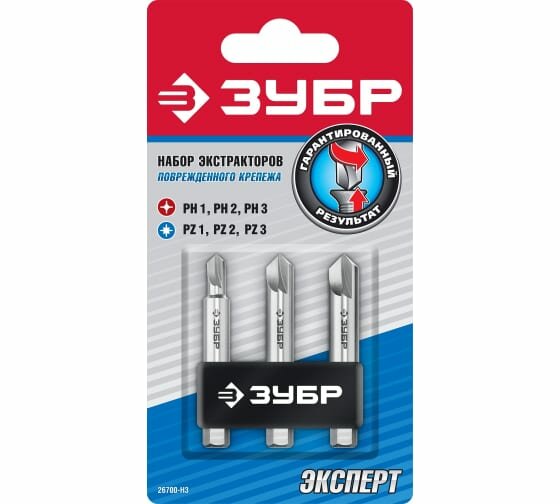 | Дополнительная информация | набор экстракторов для выкручивания крепежа; длина: 50 мм; PH1/PZ1 - 1 шт; PH2/PZ2 - 1 шт; PH3/PZ3 - 1 шт |