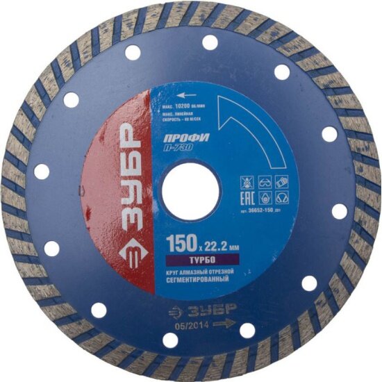 ЗУБР турборез 150 мм, диск алмазный отрезной сегментир по бетону, облицовоч кирпичу, граниту (150х22.2 мм, 10х2.4 мм), 36652-150, серия Профессионал