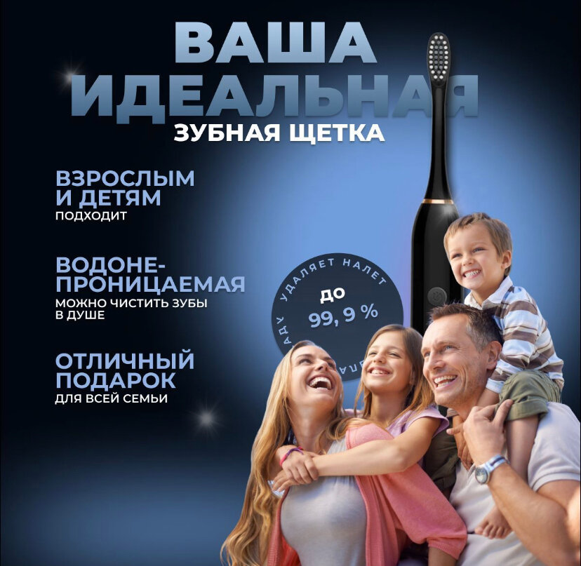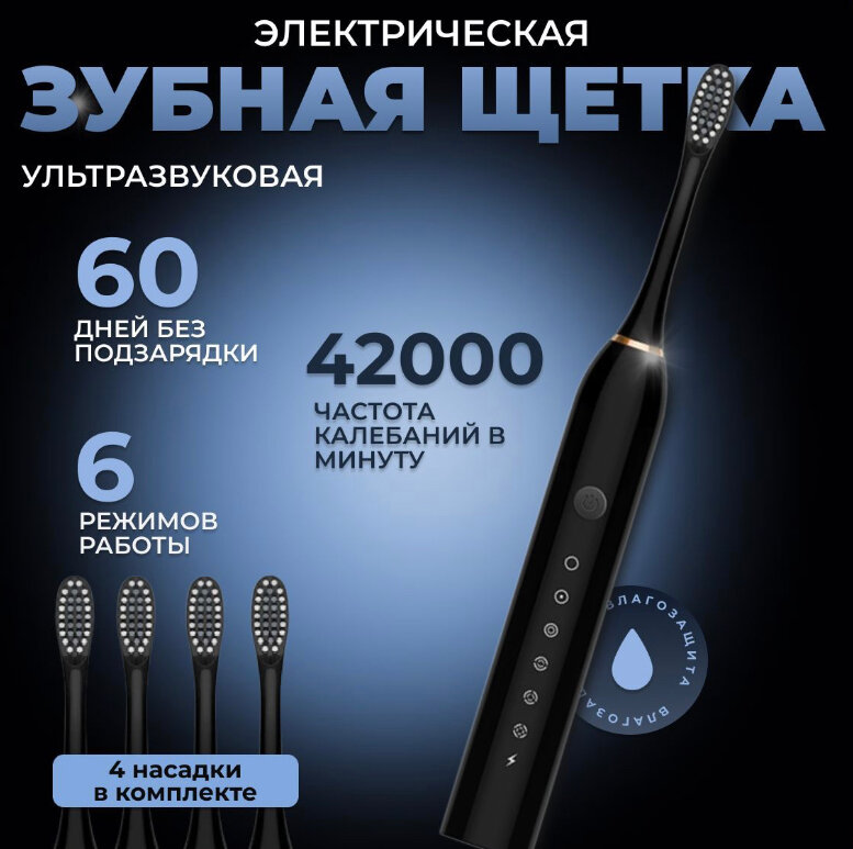 Электрическая зубная щётка X-3 / Для всей семьи / Щетка / Зубная щётка звуковая / Дешевая / Детская / Черный / 4 насадки в наборе / Sonic Elrectric Toothbrush X-3 черный