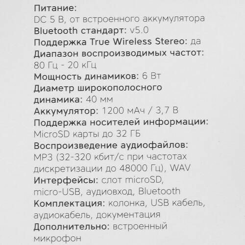 Портативная колонка TFN Quadro, 3Вт, Bluetooth 5.0, microSD, microUSB, IPX6, 1500мАч, черная