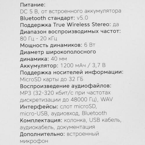 Портативная колонка TFN Quadro, 3Вт, Bluetooth 5.0, microSD, microUSB, IPX6, 1500мАч, черная