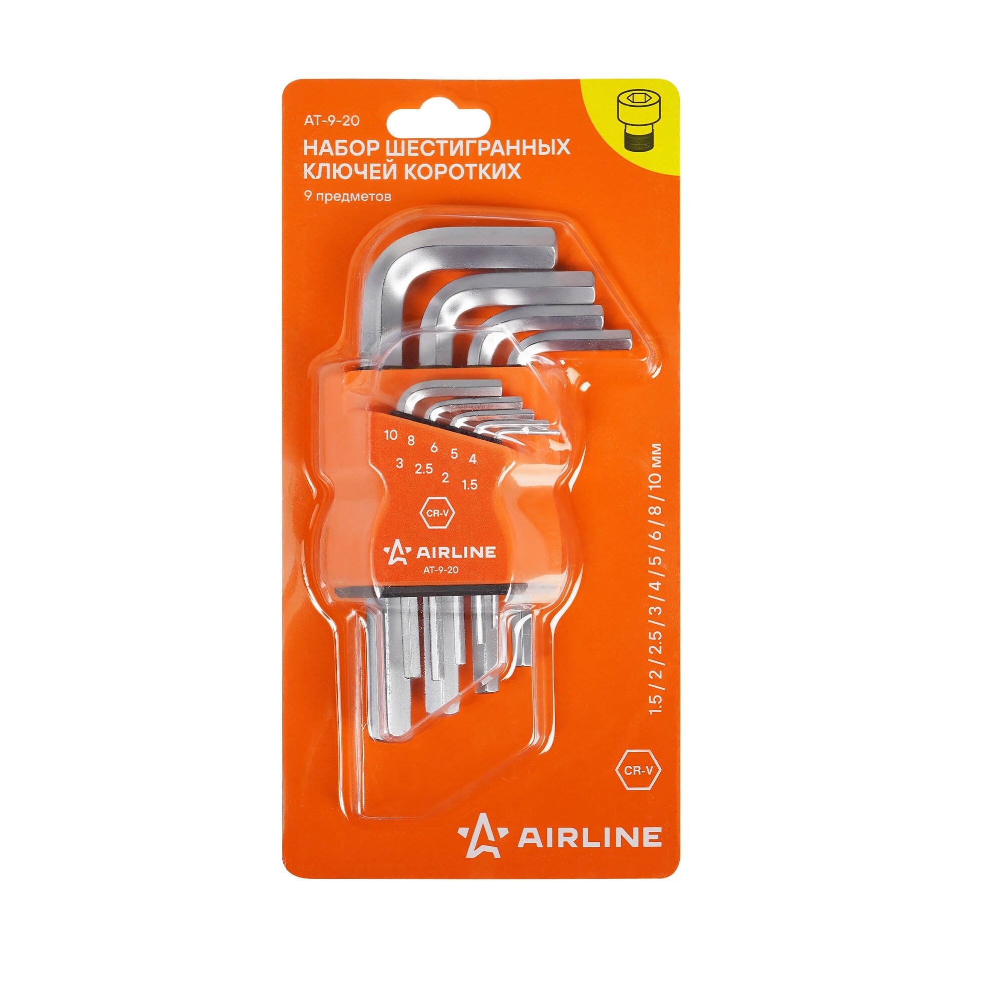 AT920 AIRLINE Набор шестигранных ключей коротких инбус 9 предметов (1.5 2 2.5 3 4 5 6 8 10мм) пласт.подвес (AT-9-2