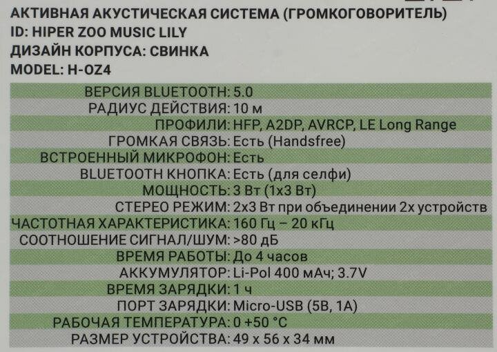 Активная акустическая система HIPER ZOO Music Lily, H-OZ4, 3 ВТ,160 Гц - 20 кГц,80 dB,400 мАч,BT 5,0,Micro-USB