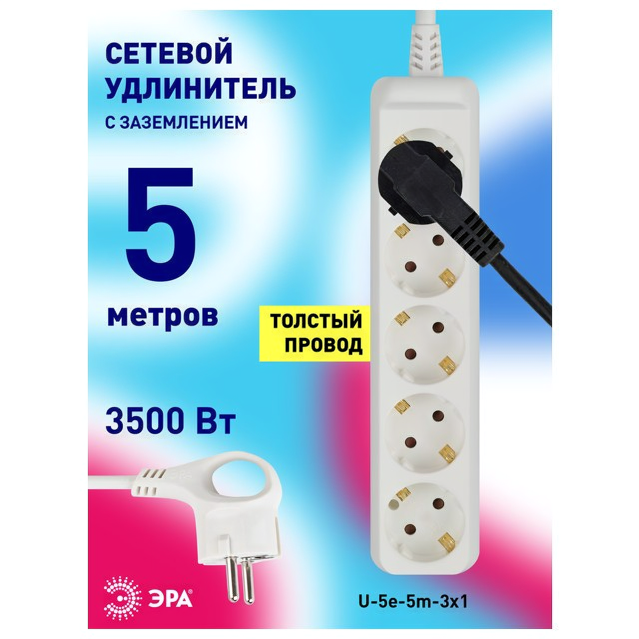 Удлинитель ЭРА U-5e-5m с заземлениемением 5 розетки 5м 16А