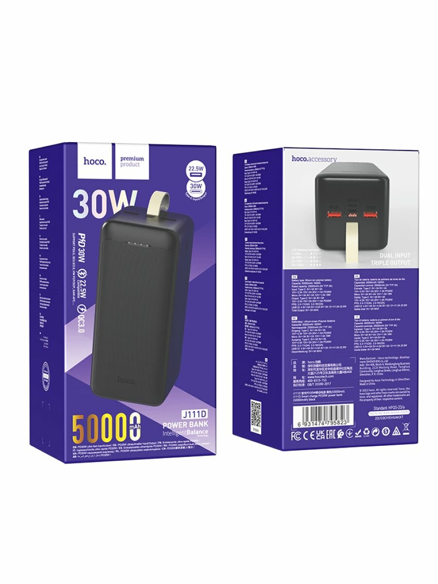 Универсальный Доп. Аккумулятор 50000mAh, J111D, HOCO, выход: 2 USB (22.5W)+1 PD (30W), черный