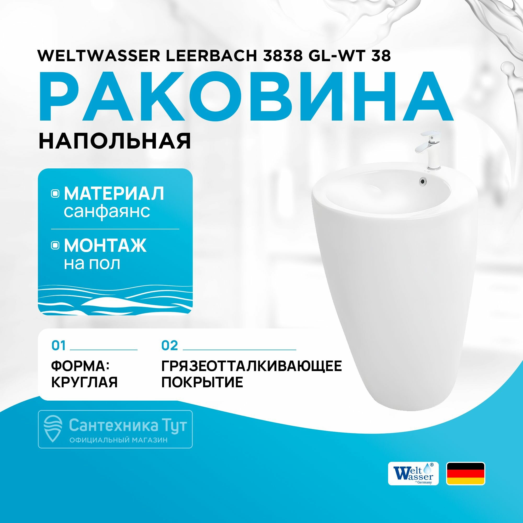 Раковина напольная WeltWasser 38/38/83 WW LEERBACH 3838 GL-WT 10000005489