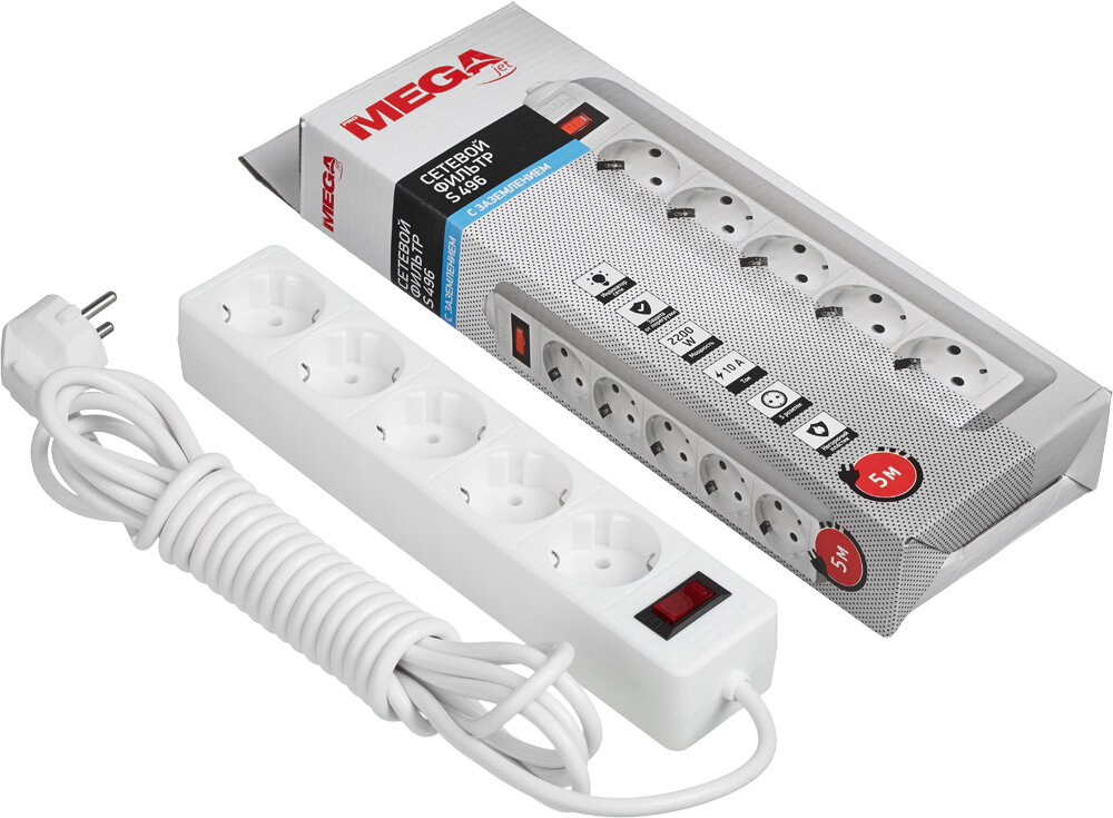 Купить Сетевой фильтр ProMEGA "Jet", 5 розеток, 5 м, с заземлением, 10 А, 2200 Вт, автоматический предохранитель, белый