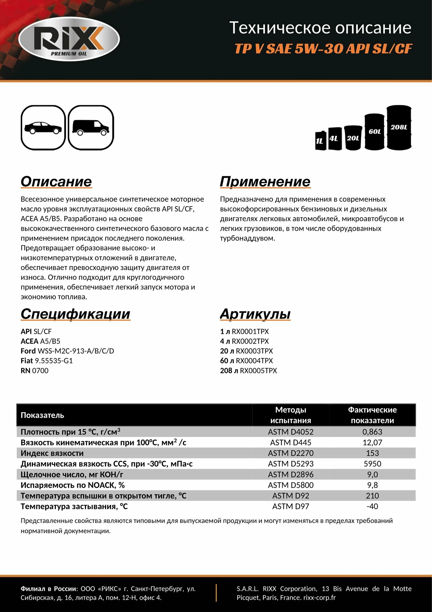 RIXX TP X SAE 5W-30 API SN/CF ACEA A3/B4 4 л, масло моторное синтетическое