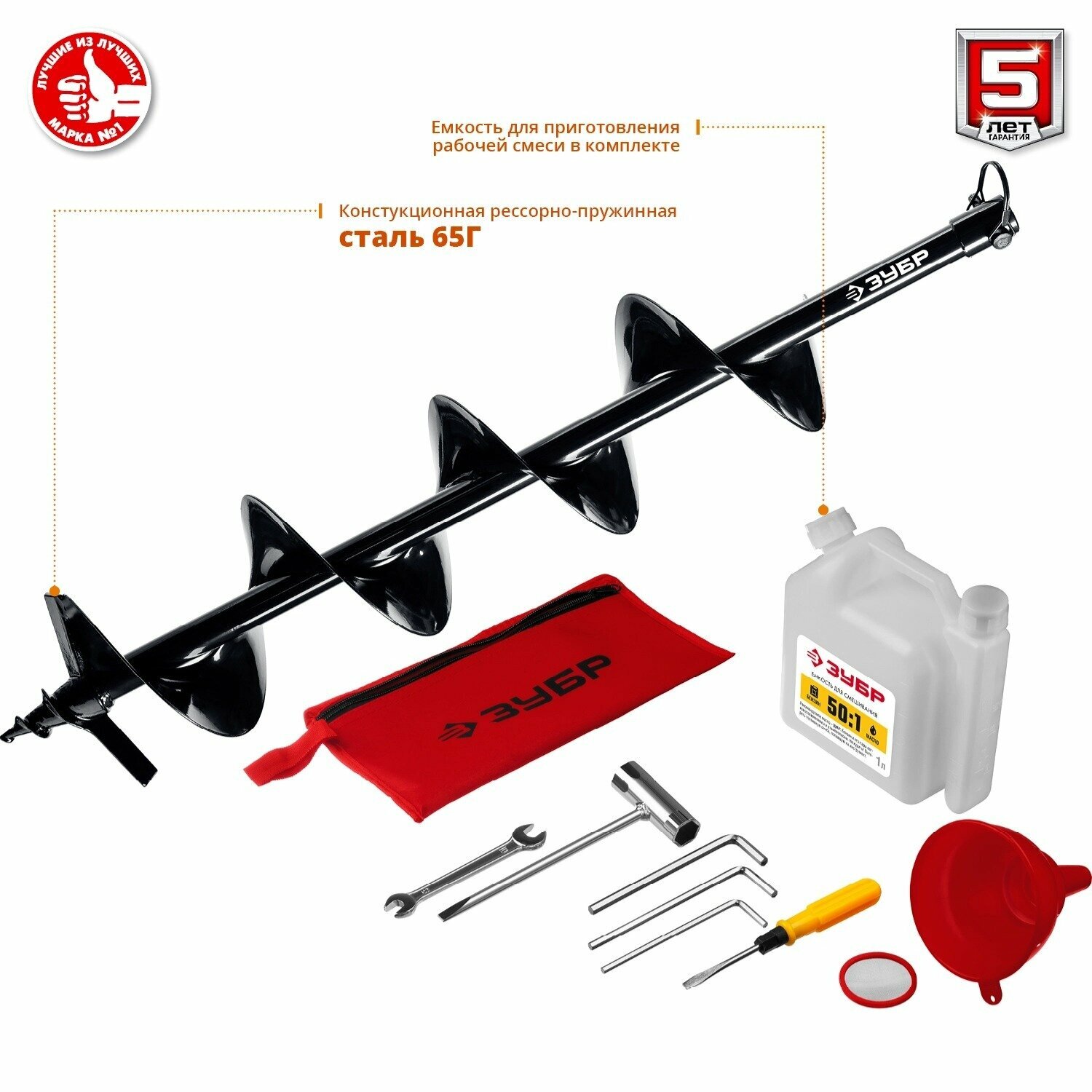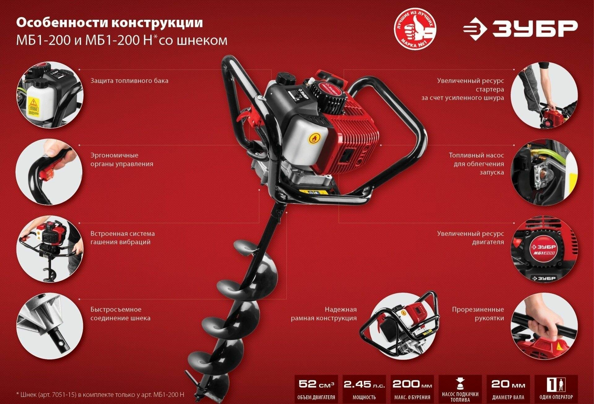 Мотобур Зубр МБ1-200 Н бытовой 2-х такт. 1800Вт 2.45л.с. 52см3 8800обмин бур в компл.