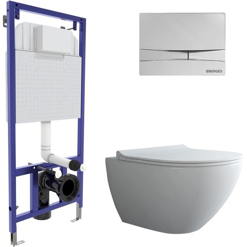 Berges Wasserhaus Комплект унитаза с инсталляцией Berges Wasserhaus Novum Rimless 043269 с сиденьем Микролифт и клавишей смыва Хром глянец