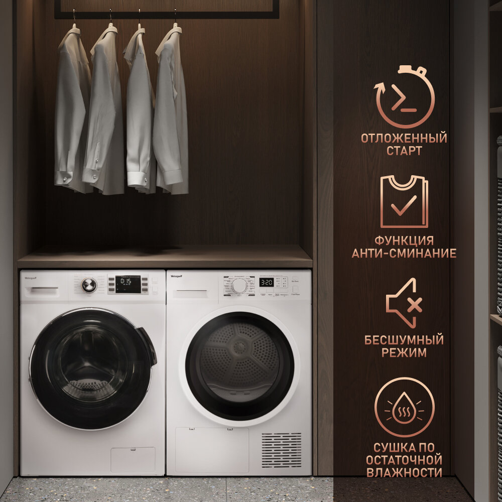 Сушильная машина Weissgauff WD 6148 D Heat Pump,3 года гарантии, Тепловая помпа, 8 кг загрузка, 14 программ, Внутренняя подсветка, Сушка по времени 10-30 мин, Освежение, Установка в колонну со стиральной машиной интересное: