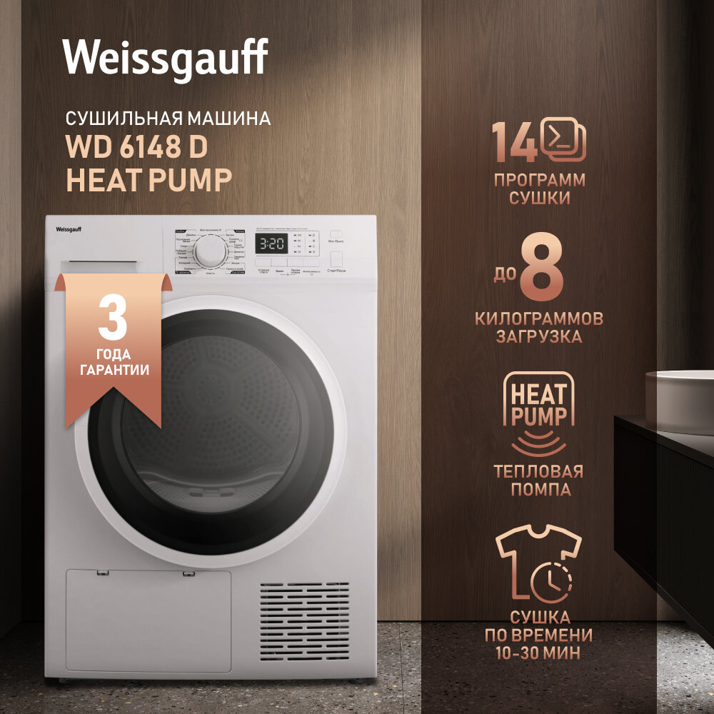 Купить Сушильная машина Weissgauff WD 6148 D Heat Pump,3 года гарантии, Тепловая помпа, 8 кг загрузка, 14 программ, Внутренняя подсветка, Сушка по времени 10-30 мин, Освежение, Установка в колонну со стиральной машиной