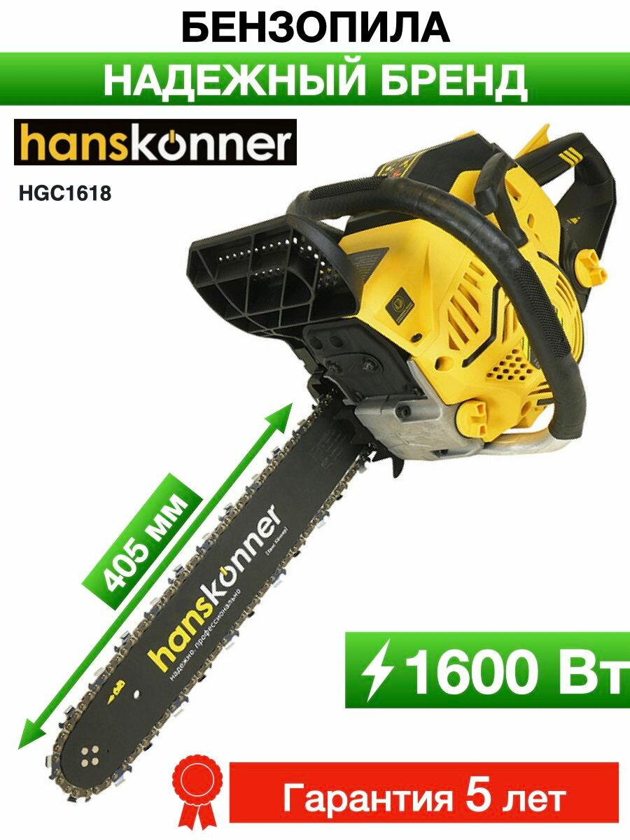 Бензопила Hanskonner HGC1618 (1.6 кВт/2.4 лс, 45 см3, 3200об/мин, шина 16", 6,65кг)