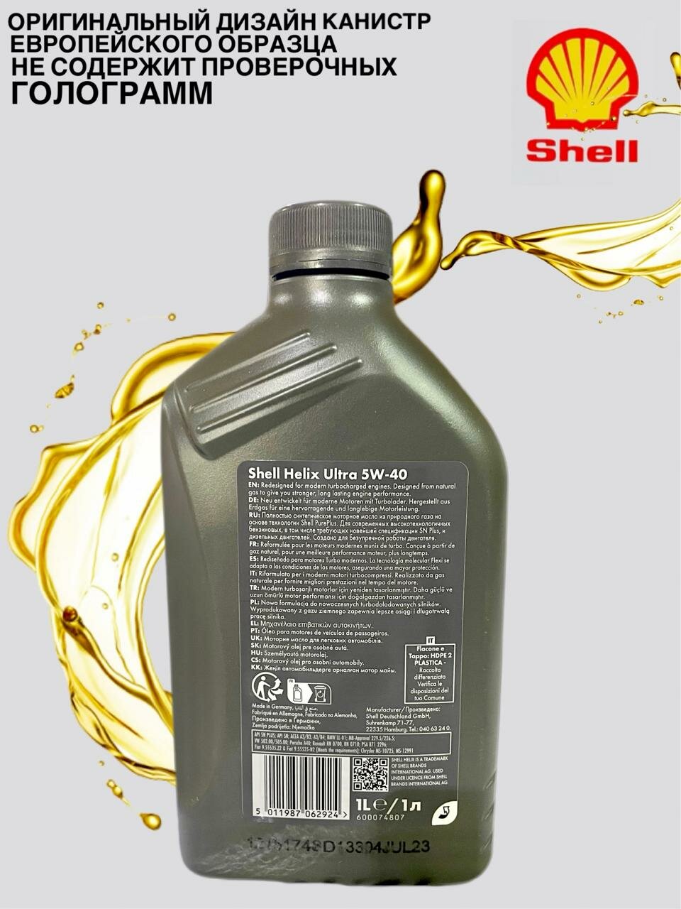 Синтетическое моторное масло SHELL Helix Ultra SN 5W-40, 1 л (Германия)