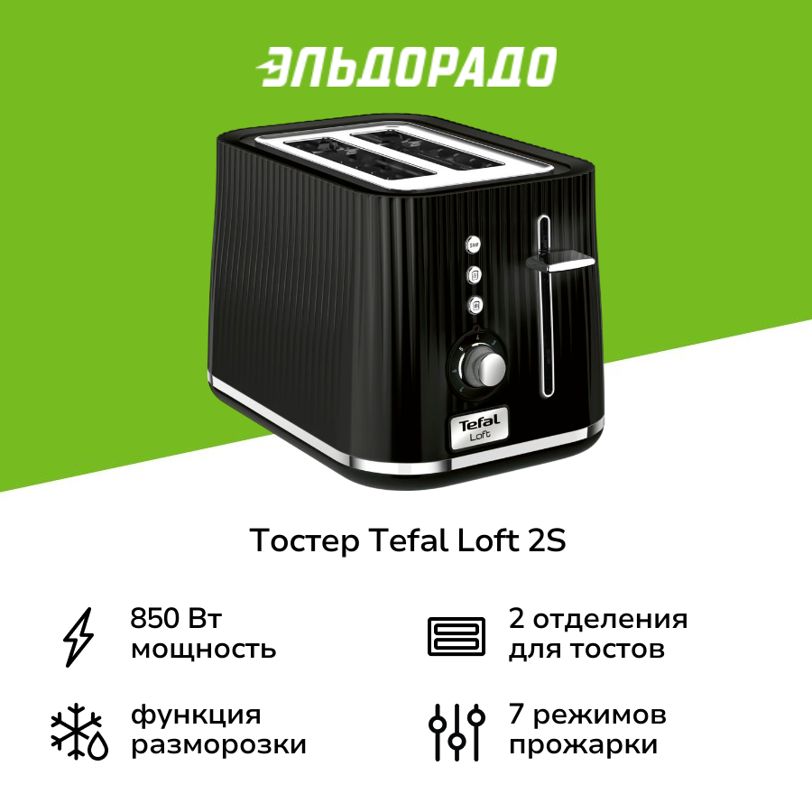 Купить Тостер Tefal Loft 2S TT761838 с 7 уровнями прожарки, разморозкой и подогревом, 2 широкими слотами, высоким подъемом, 850 Вт, черный