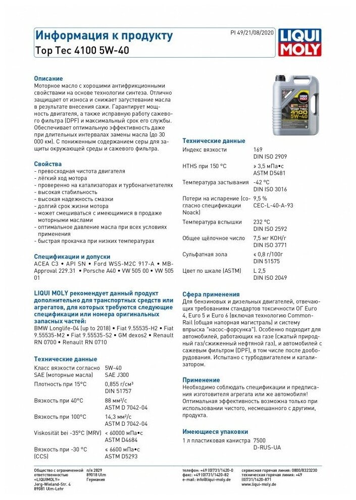 Ниже Вы можете прочитать отзывы на Моторное масло Liqui Moly Top Tec 4100 5W-40 HC-синтетическое 5 л ., ознакомится с подробными характеристиками, посмотреть интересные обзоры и фотографии на Моторное масло Liqui Moly Top Tec 4100 5W-40 HC-синтетическое 5 л ..