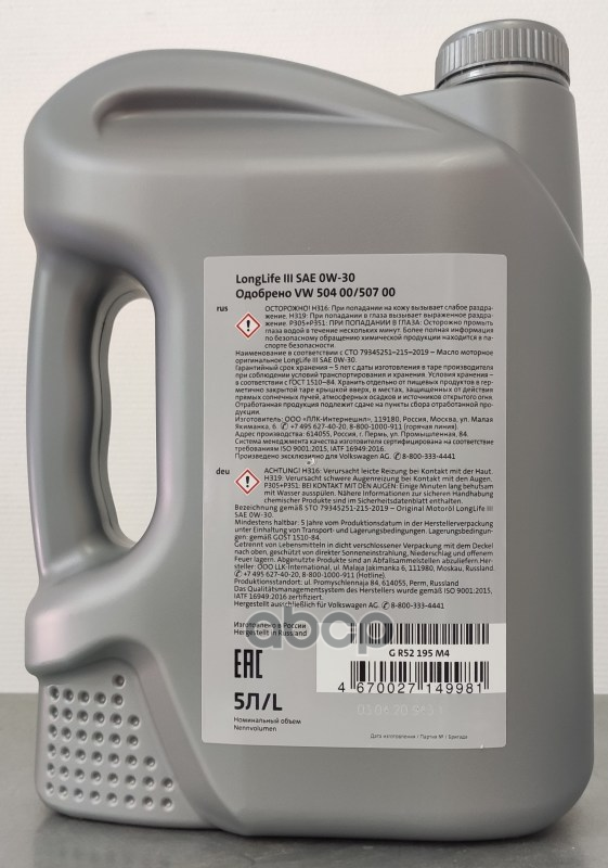 VAG Gr52195m4_масло Моторное 0w30 (5l) Eu Vag Longlife Iii! (Синт.) Vw 504.00/507.00