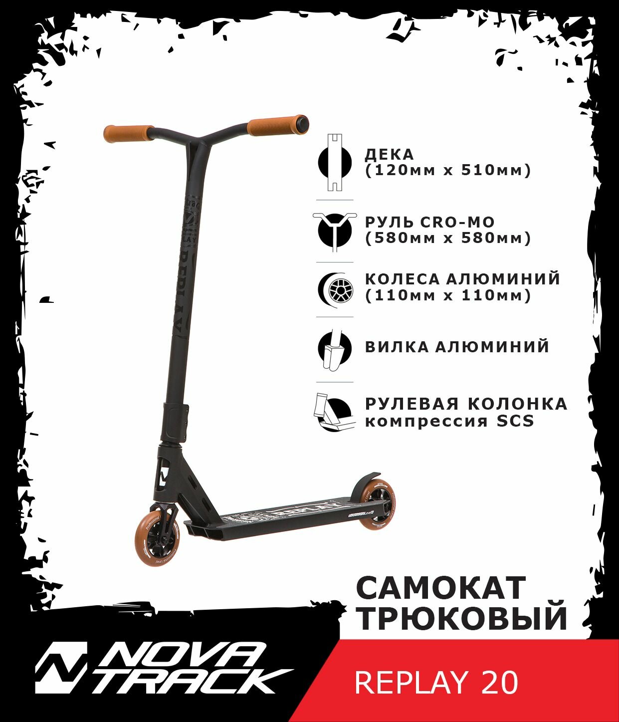 Купить Самокат трюковый NOVATRACK REPLAY, колеса 110 мм с алюмин ободом, фигурная рама, размер грипс 140мм со вставками из неохрома на конце, алюмин.кованная вилка, пром.подшипник, черный