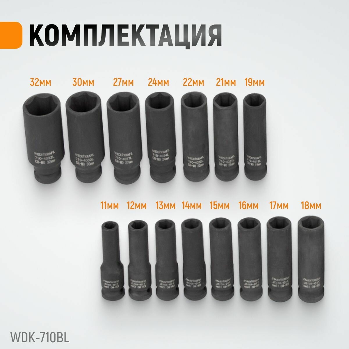 WIEDERKRAFT Набор ударных головок глубоких 1/2" 15 предметов, 10-32 мм. WDK-710BL