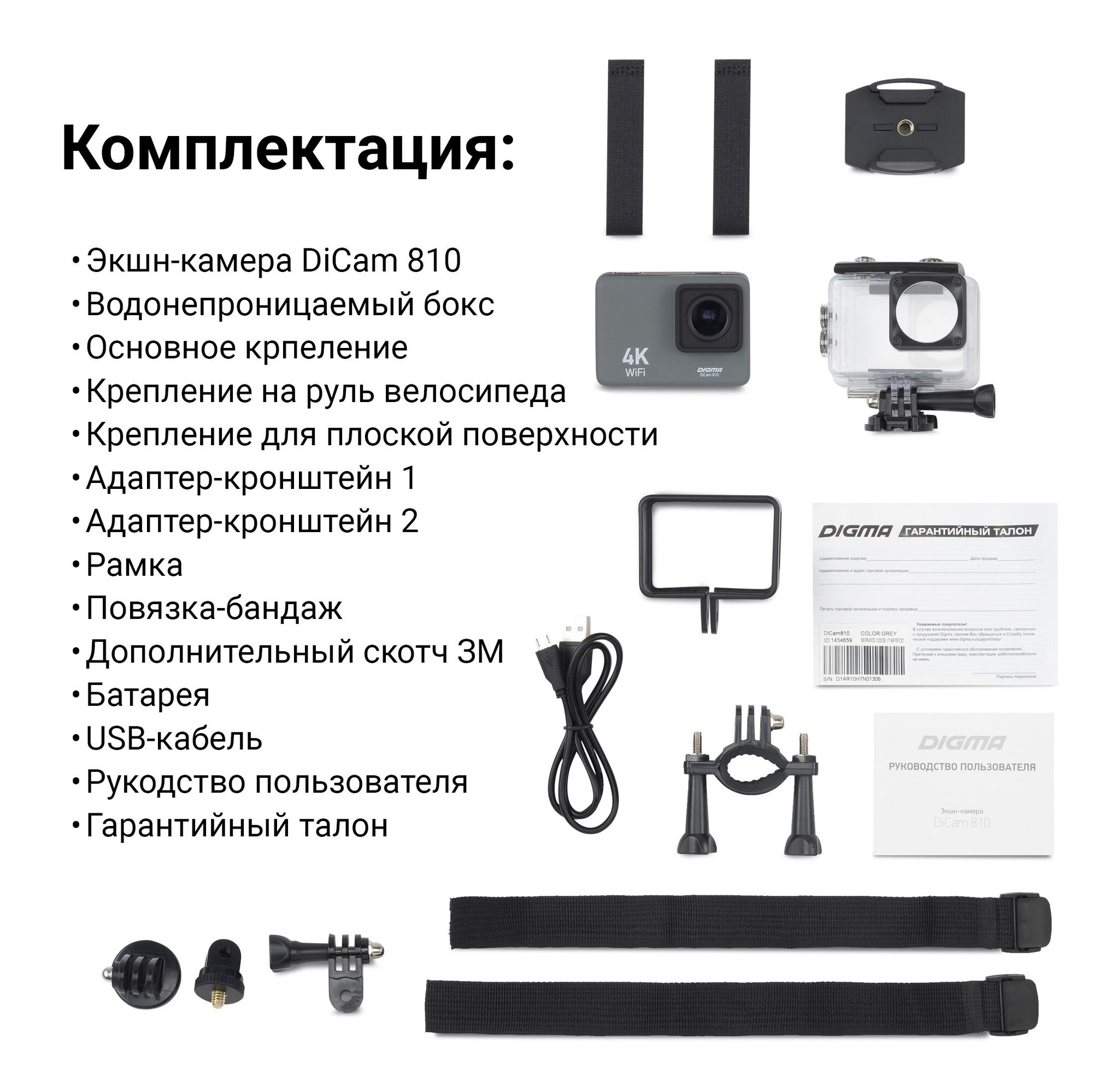 Купить экшн камера, экшен камера Digma DiCam 810 Grey 4K, WiFi
