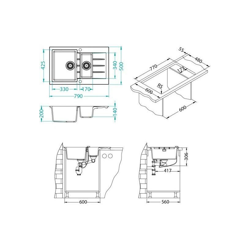 Каменная мойка для кухни с двумя чашами и крылом ALVEUS GRANITAL CADIT 70 TERRA - G22 790 X 500 искусственный камень гранит с сифоном. Цвет песчаный
