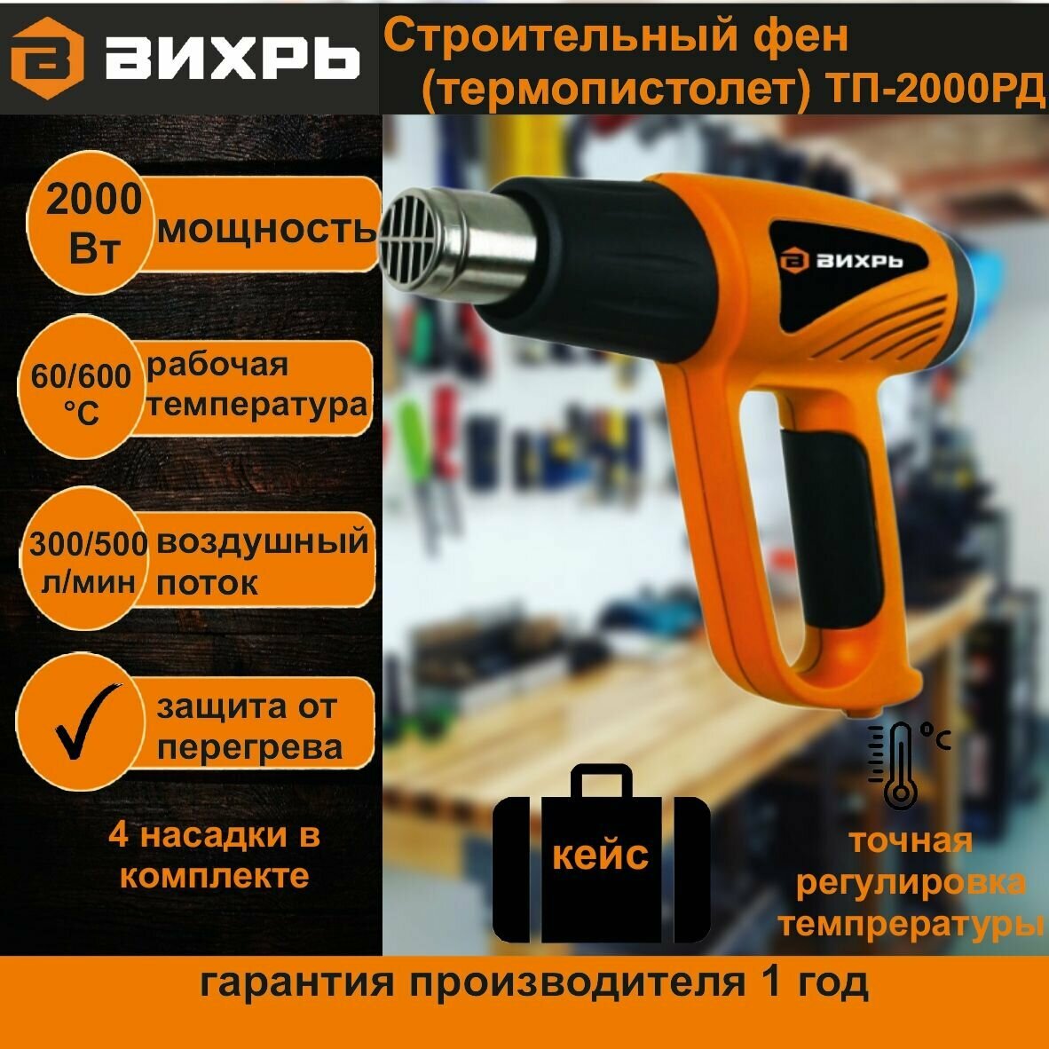 Строительный фен (Термопистолет) ТП-2000РД вихрь // 2000 Вт, 300/300/500 л/мин, мах t 600 C, регулировка температуры, дисплей