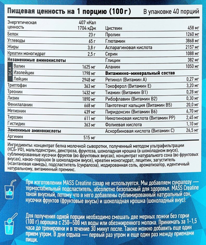 | Отзыв: | Даёт результат, насыщает организм углеводами. Результат появляется после активной тренировки, иначе масса будет набираться за счёт жировых отложений. |