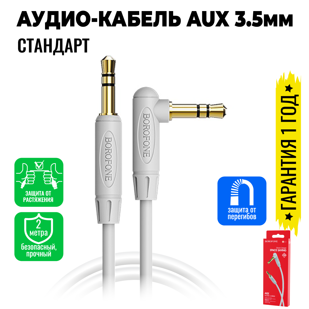 Аудио кабель aux акустический стерео аукс в машину, для наушников, в колонку 3,5 мм jack 2 метра, длинный / BOROFONE BL4