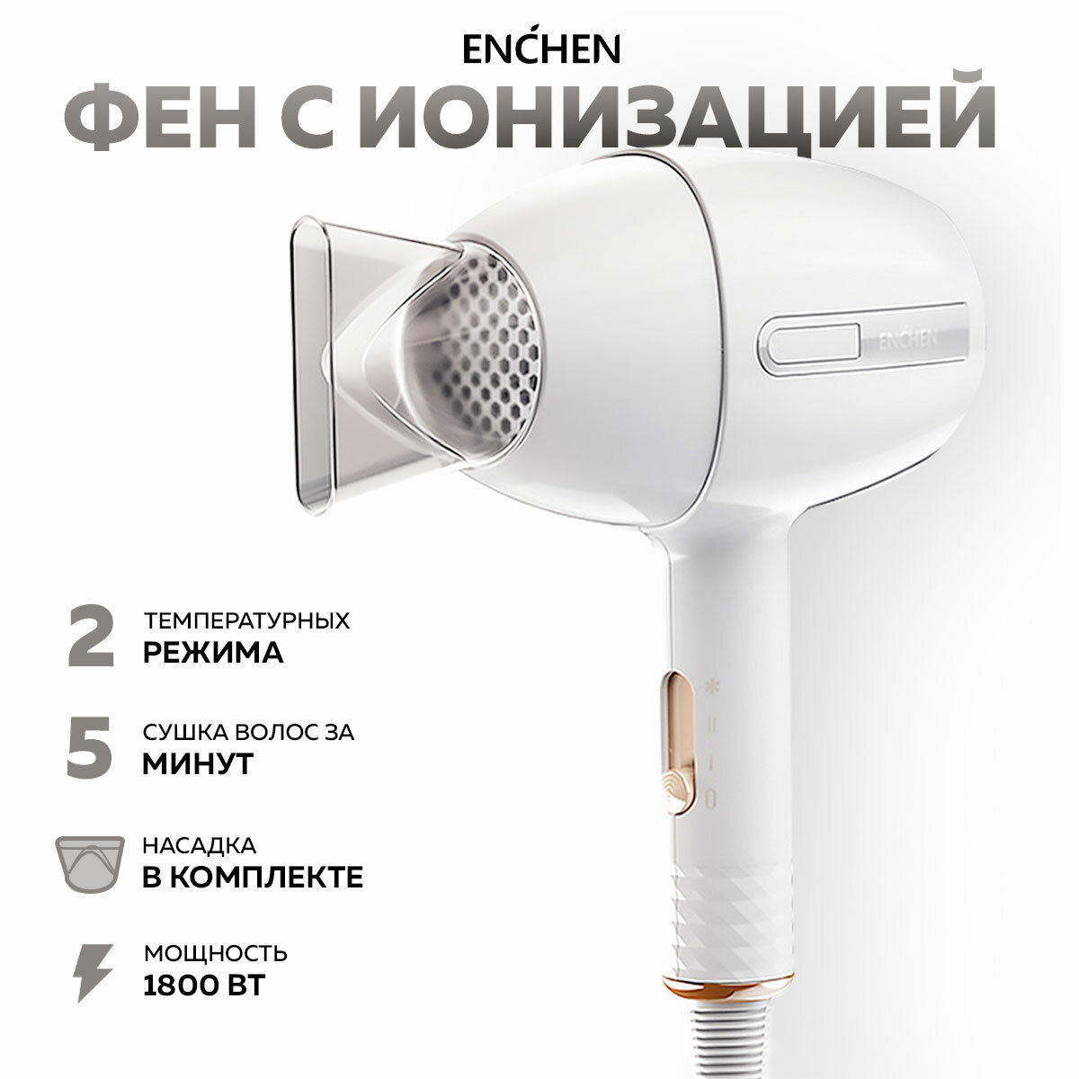 Фен профессиональный для волос Enchen Air Hair Dryer / Дорожный фен с насадкой для сушки и укладки волос, с ионизацией, 3 температурных режима, белый