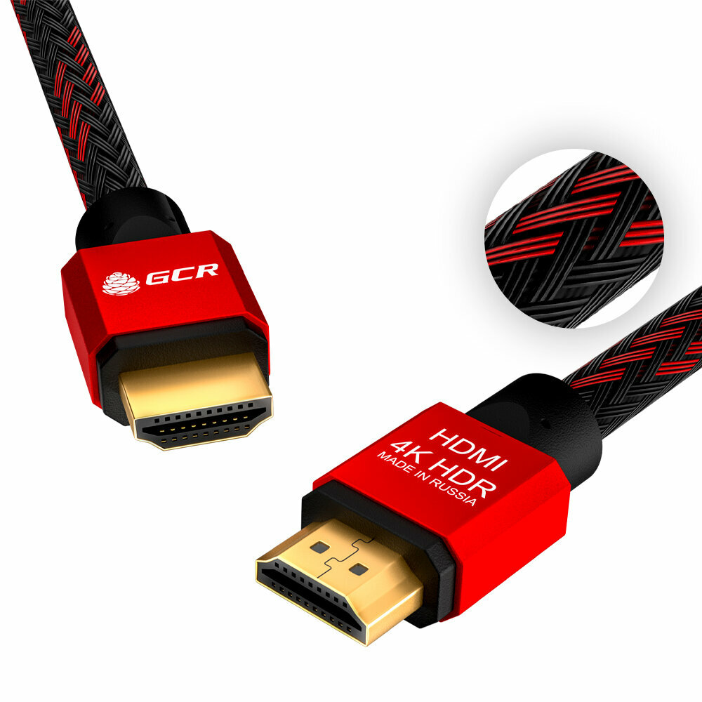 Кабель HDMI 1.5м GCR Ultra HD 4K 3D 18 Гбит/с нейлон частично черно-красный с позолоченными контактами и коннекторами