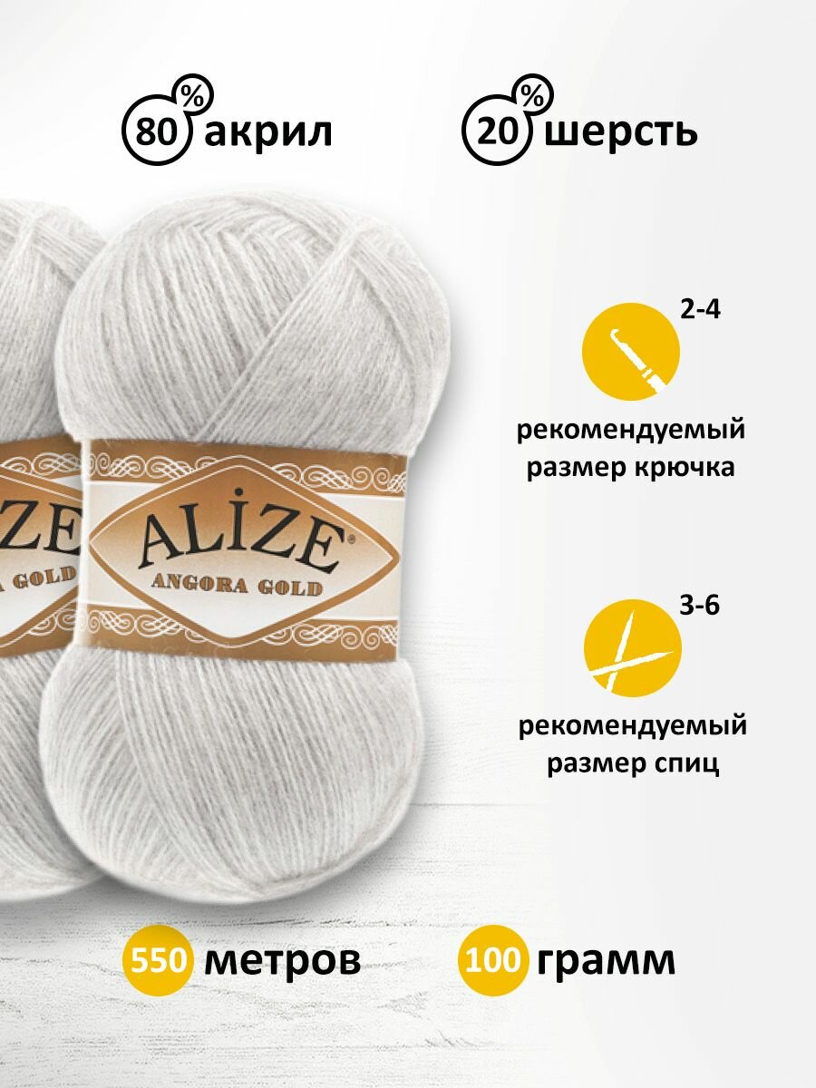 Пряжа для вязания ALIZE Angora Gold (Ангора Голд) цвет: светло-серый 208 , 5 мотков*100г*550м 20% шерсть 80% акрил
