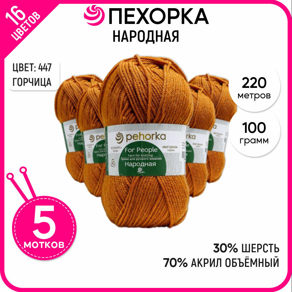 Пряжа для вязания Пехорка 'Народная', 100г, 220м (30% шерсть, 70% акрил высокообъемный) (447-Горчица), 5 мотков