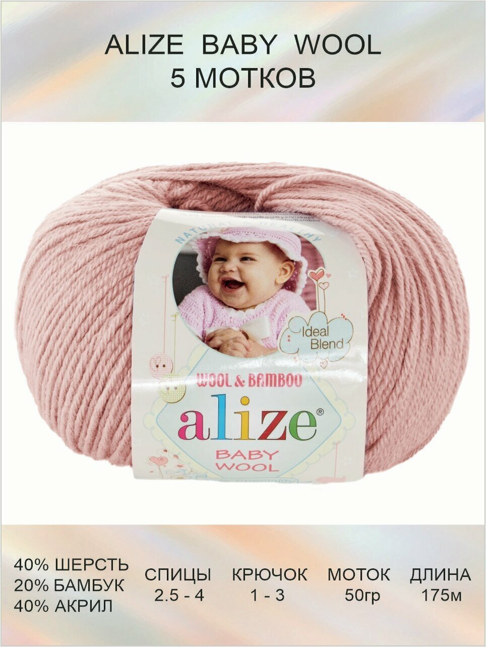 Пряжа для вязания ALIZE BABY WOOL Ализе Бэйби Вул Детская: 185 (светло-розовый) / 5 шт / 175 м / 50 г / 40% шерсть, 20% бамбук, 40% акрил