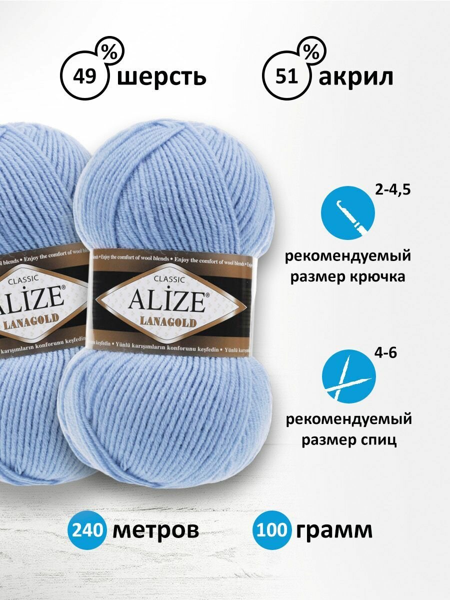 Пряжа ALIZE "Lanagold", 51% акрил, 49% шерсть, 240 м*100 г, 40, голубая, 1 шт