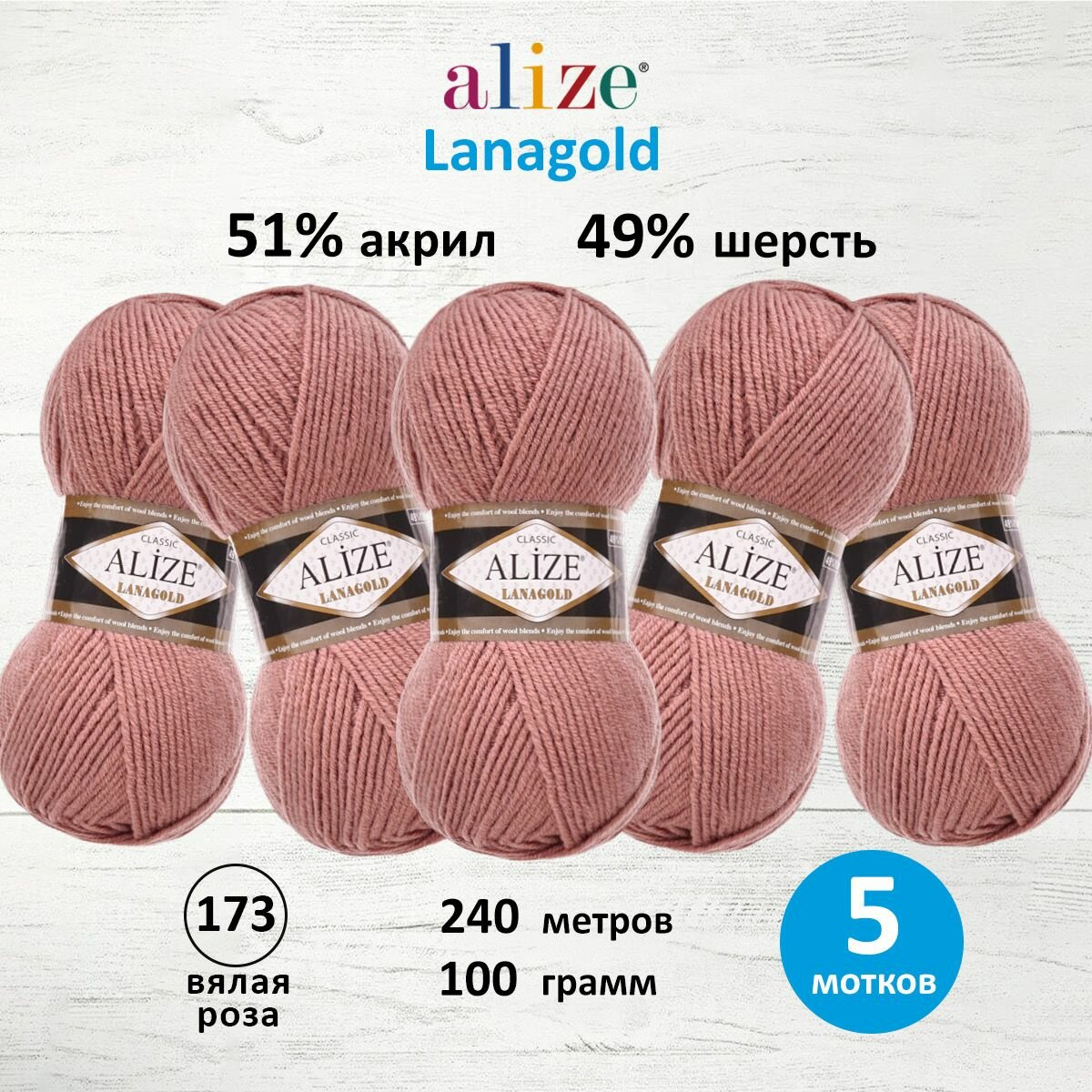 Купить Пряжа для вязания ALIZE 'Lanagold', 100г, 240м (49% шерсть, 51% акрил) (173 Вялая Роза), 5 мотков