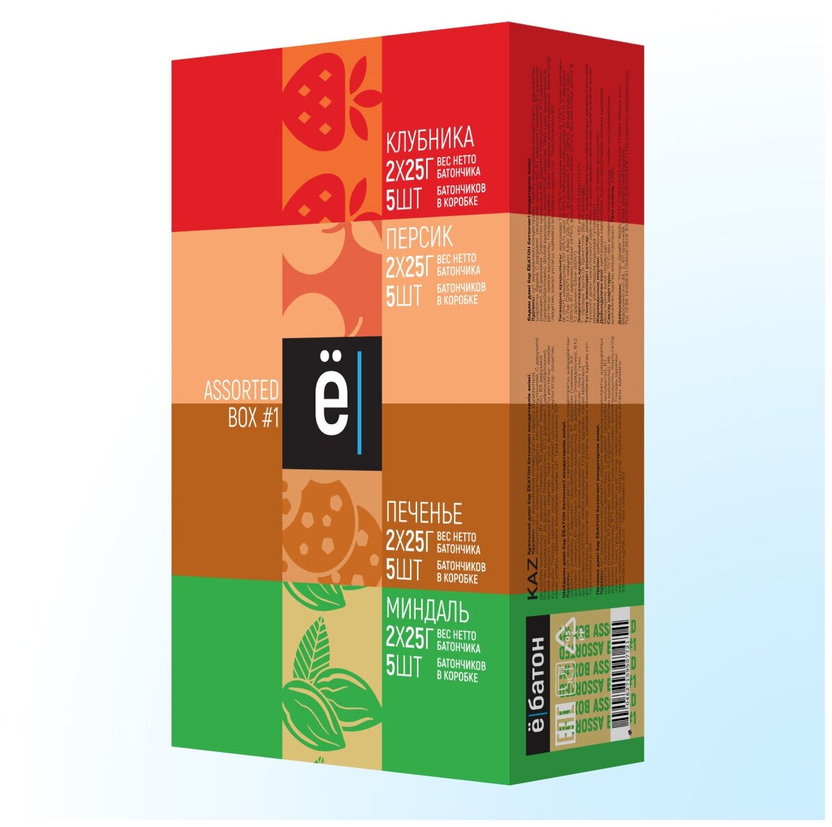 Купить Ассорти №1 Шоу-бокс изделие кондитерское батончик Ёбатон 20% белка, 20шт х 50г (печенье х 5шт., персик х 5шт., миндаль х 5шт., клубника х 5шт.)