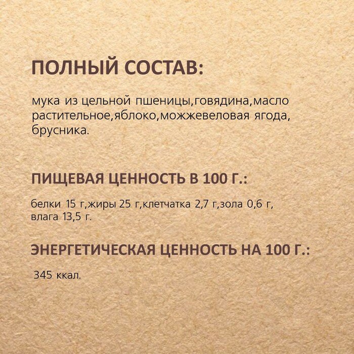 | Плюсы: | Удобная форма печенья, собака обожает их. В составе злаки, мясо говядины, ягоды. |