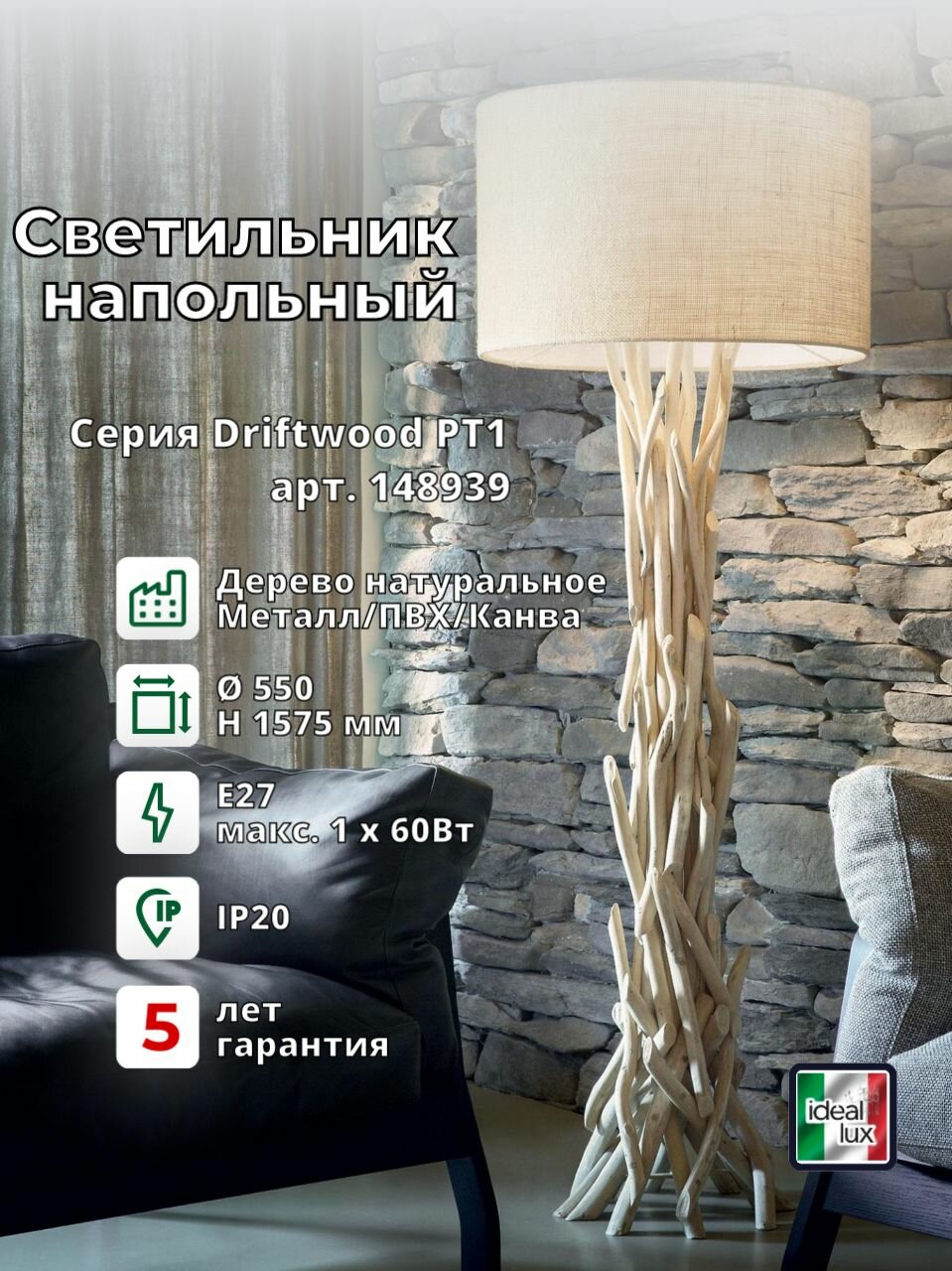 Торшер напольный ideal lux Driftwood PT1 макс.1х60Вт IP20 Е27 230В Дерево Дерево/Металл/ПВХ/Канва Выключатель Без ламп 148939. интересное: