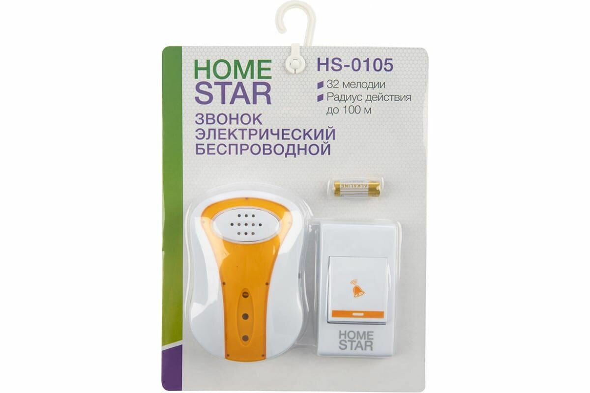 Звонок беспроводной HS-0105 32 мелодий радиус 100М 2XAAA кнопка блистер (60) HOMESTAR